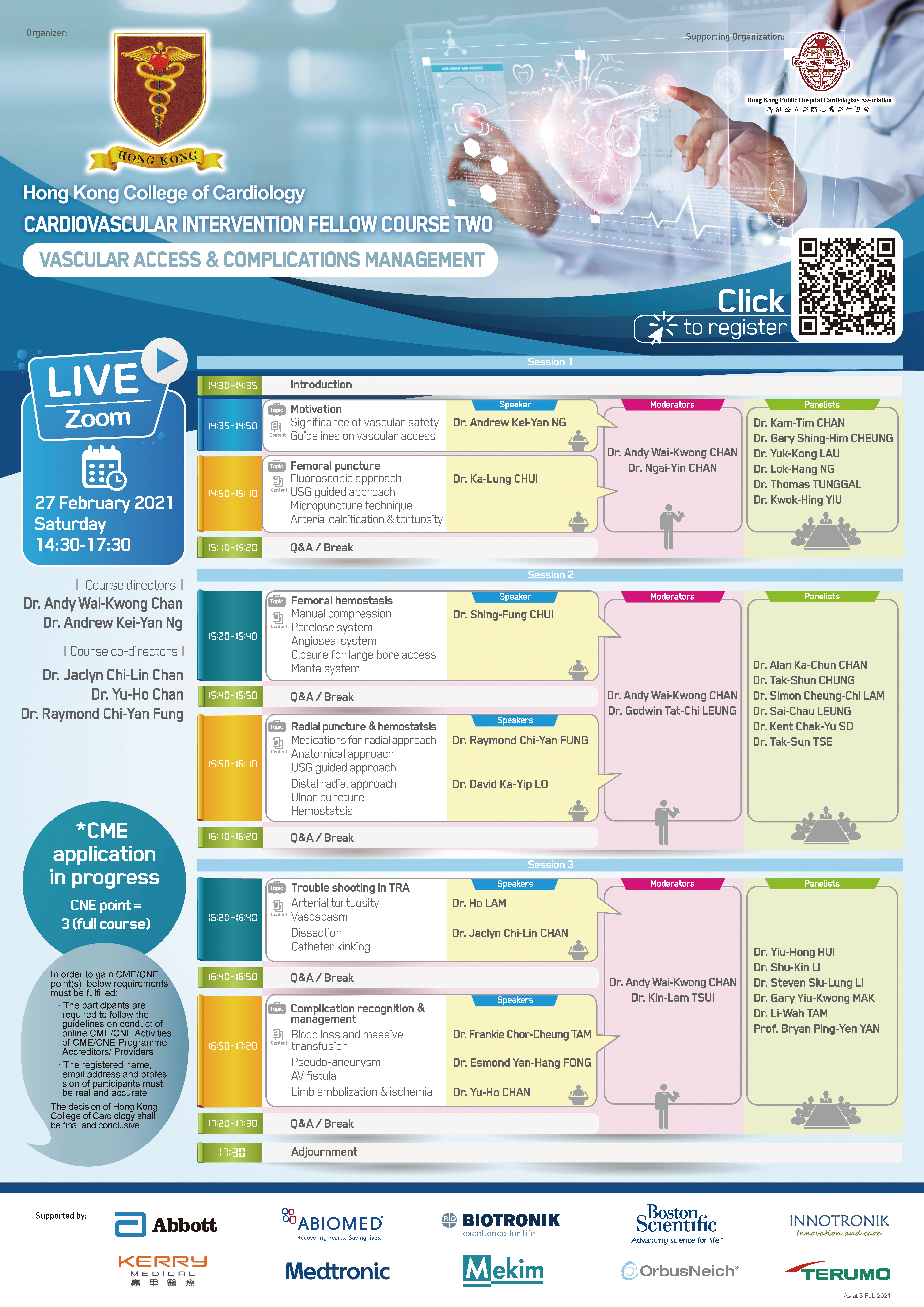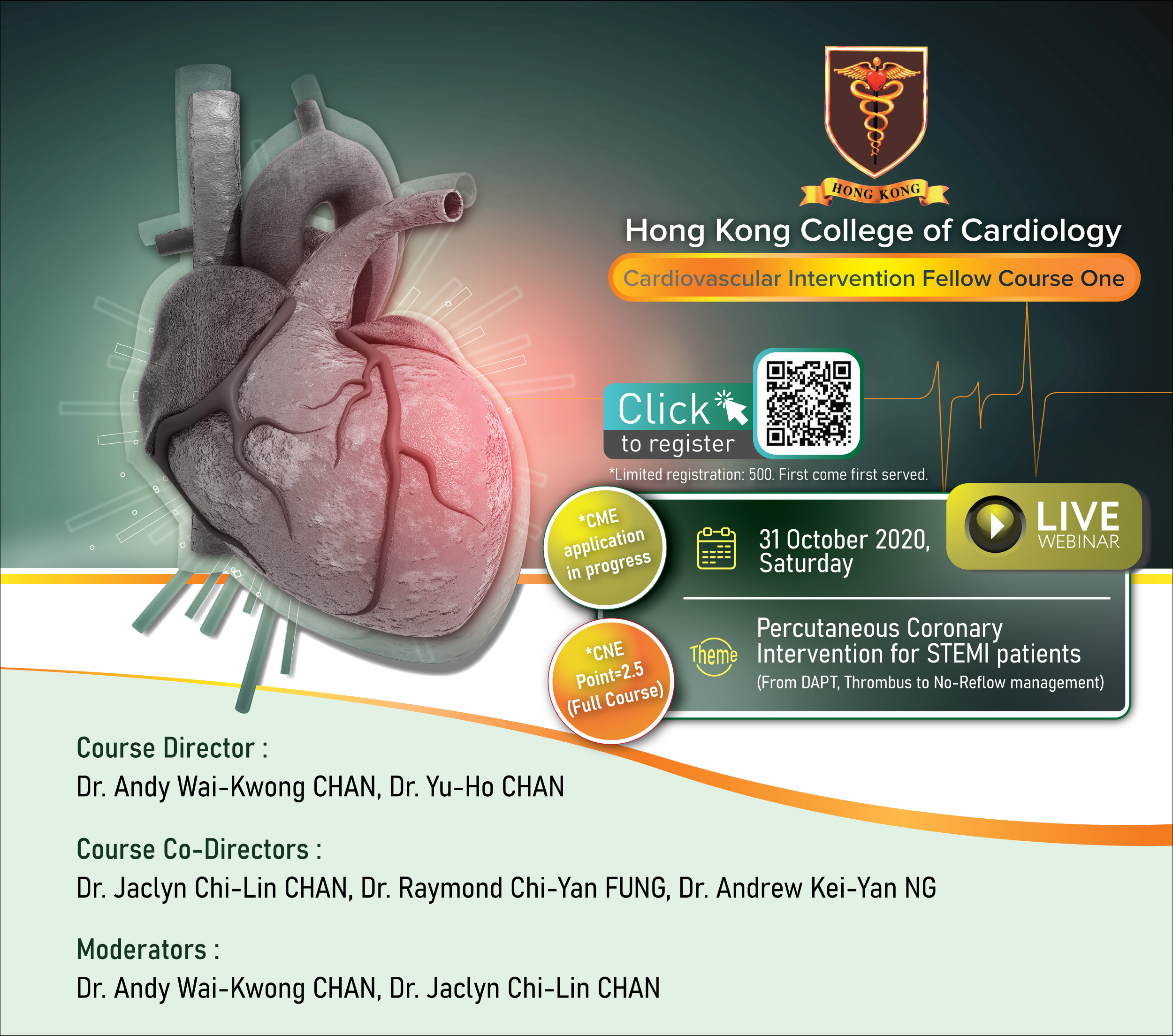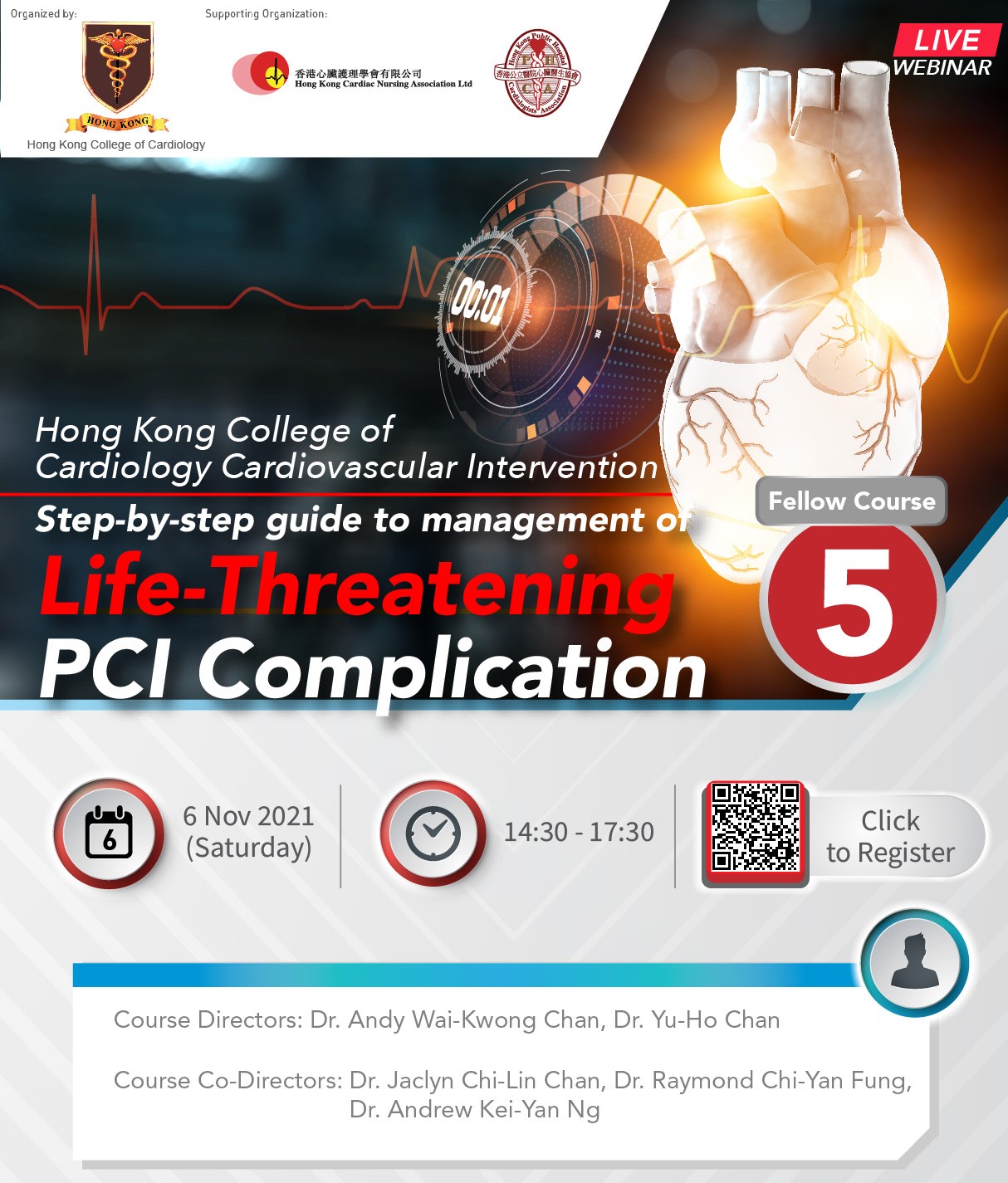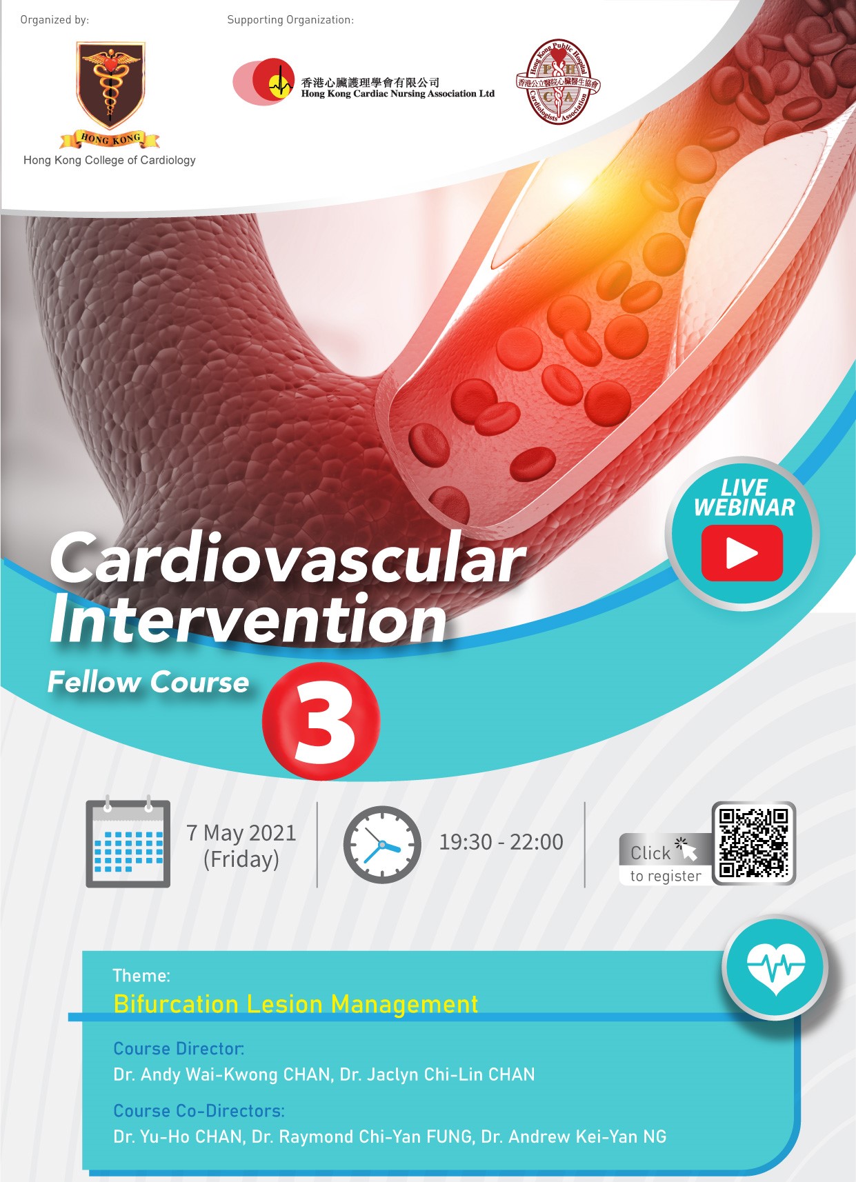 The first HKCC CVI Fellow Course will be held on 31 October 2020 from 1430 to 1730 in virtual format. A series of HKCC CVI Fellow Courses on different topics will follow on 27 February 2021, 7 May 2021 and 7 August 2021. We hope our cardiologist and allied cardiovascular health professionals will also find these courses useful.